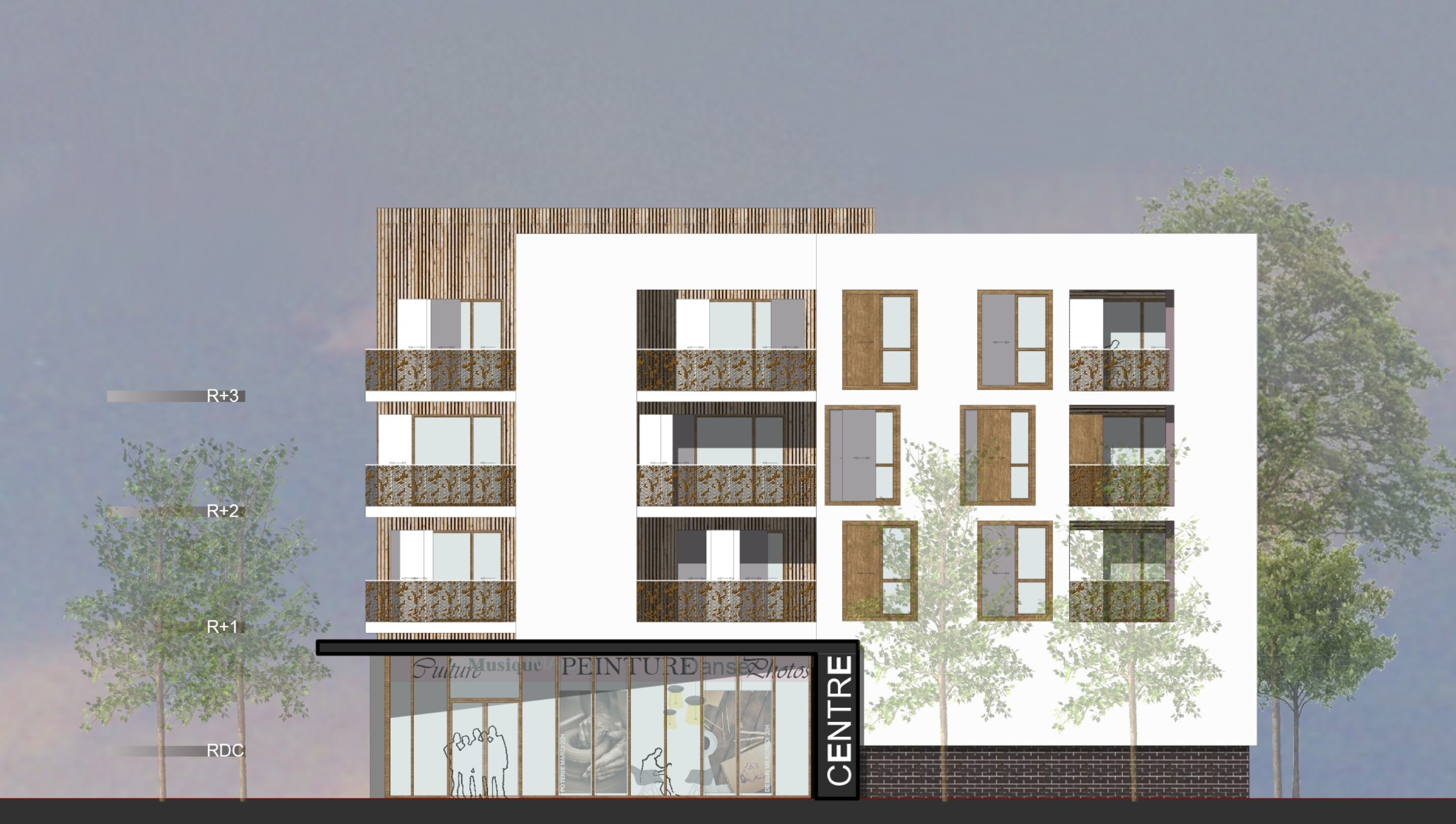 Ce projet consiste en la construction d’une opération mixte comprenant 33 logements, un parking de 33 places en infrastructure et un centre social en rez-de-chaussée. Inscrite dans un concours de maîtrise d’œuvre, la proposition s’intègre pleinement dans la dynamique de transformation du quartier de la Croix Bonnet à Bois d’Arcy, un secteur en renouveau marqué par la proximité d’un canal et d’une voie verte. Le parti architectural s’attache à dialoguer avec les constructions voisines tout en affirmant une identité contemporaine. Le travail des volumes joue un rôle central : des hauteurs différenciées permettent de créer un rythme harmonieux et de rompre la linéarité du bâtiment d’angle. Cette composition apporte de la respiration au projet et favorise une insertion plus douce dans le paysage urbain. La matérialité, associant la brique et le bois, renvoie directement au langage architectural local et contribue à l’ancrage du bâtiment dans son environnement. Chaque logement bénéficie d’un balcon, offrant aux habitants un espace extérieur qualitatif et la possibilité de profiter du cadre calme et paysager qu’offre la proximité du canal. Le rez-de-chaussée accueille un centre social, pensé comme un lieu de rencontre, de services et de vie collective, renforçant la dimension sociale et urbaine de l’opération. L’ensemble forme une architecture cohérente, ouverte sur son environnement et attentive au bien-être des futurs habitants.